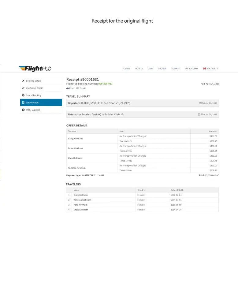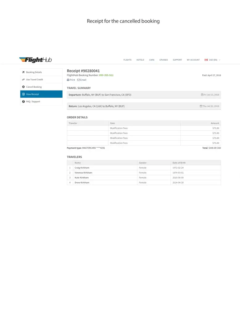 Below I have recapped my interactions with FlightHUB. Receipts are attached.