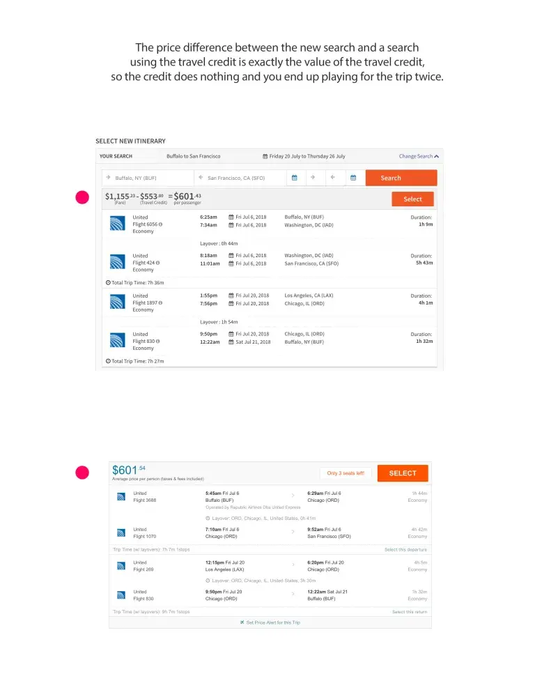 I found a flight that worked (to the same location on the same airline as the original purchase - San Francisco, United Airlines) and attempted to use my travel credit to pay for the new ticket. In the payment stage of the transaction, I couldn't find a way to apply my travel credit. I then found a "book with credit" option. You click on it and then search for flights. I found that there was a huge difference between the "book with credit" price and the cost of the same flight using a "regular consumer" search. The "book with credit" flight was way more expensive. The difference in price was exactly the value of the travel credit. So the credit had no value. Ultimately, I would pay for the flights twice if I went with the "pay with credit" option.