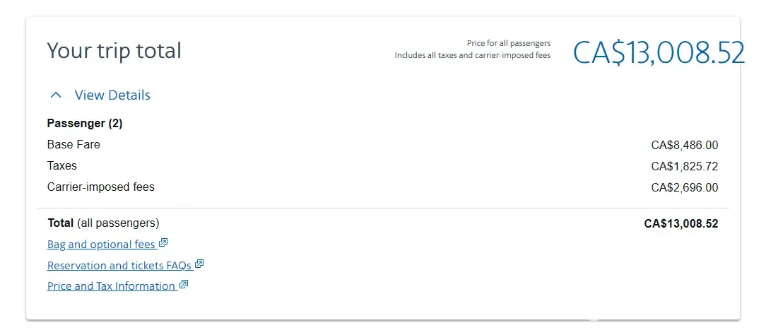 Booked a round trip for two adults, however, post booking on the Airlines website there was price difference of over a CA$1000's.