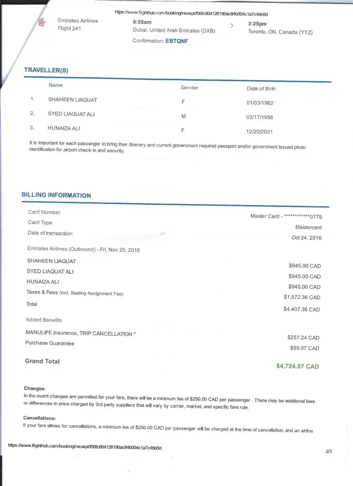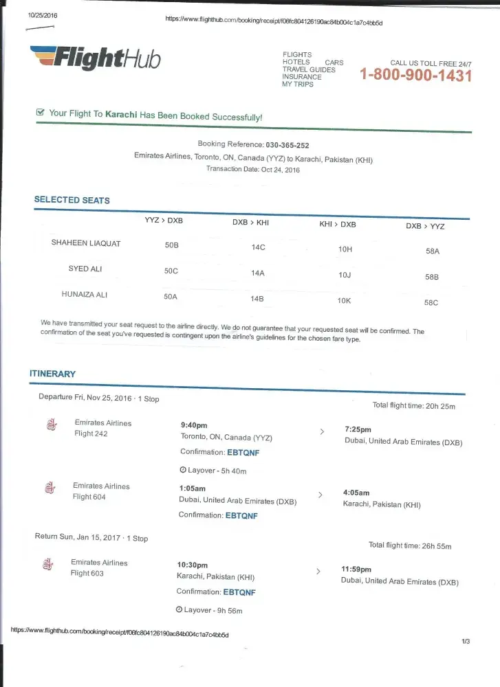 FlightHub purchased airline ticket from toronto to karachi
