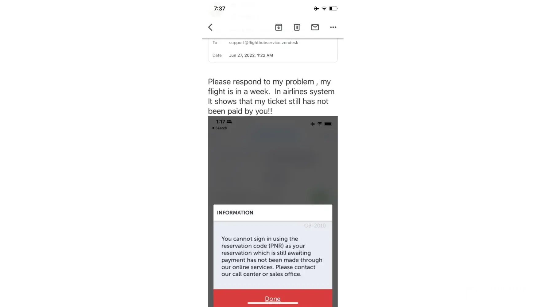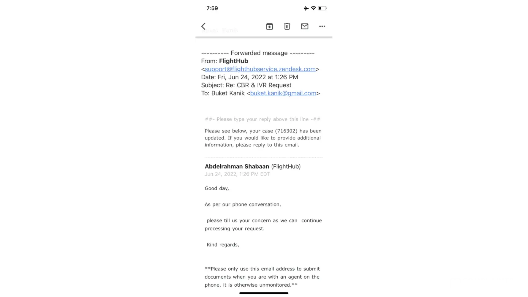 6. My flight is scheduled for today(7/2) night so here I am informing you at 1557H that I purchased cancellation insurance via Flighthub, and that due to my wife’s medical conditions, we are unable to take the flight and we need a full refund.
