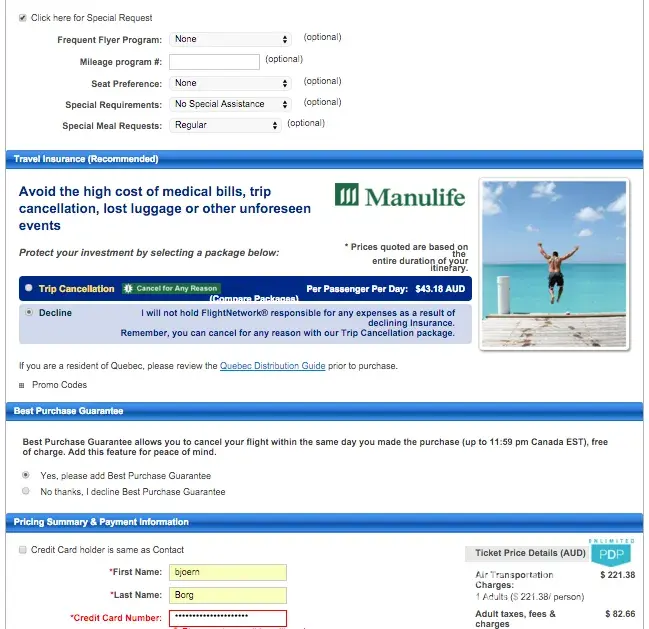I booked flight through the company www.flightnetwork.com. I was really upset that the company decided to fool me. They took money for the tickets and for the return flight as well, but after that they added some fake fees to my bill. They provided this bill and asked to pay for it within couple of hours or they would cancel my booking. WTF? I paid and they provided my tickets, but I wasn’t happy about this situation. Not recommended website and post comments about your experience with them.