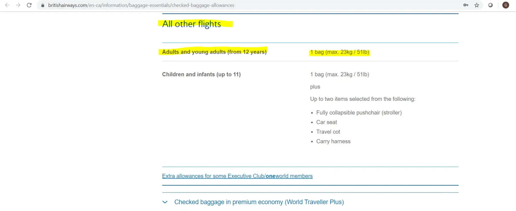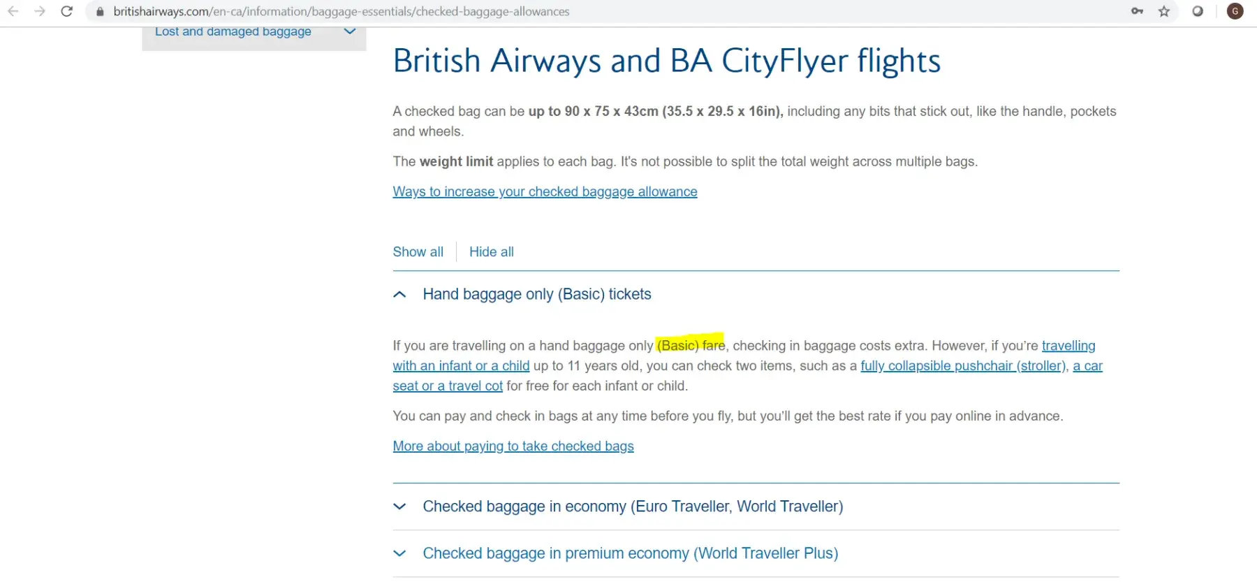 - I purchased my flight as Economy fare with British Airways, I checked the British Airways Baggage policy which includes 1 baggage for Economy https://www.britishairways.com/en-ca/information/baggage-essentials/checked-baggage-allowances