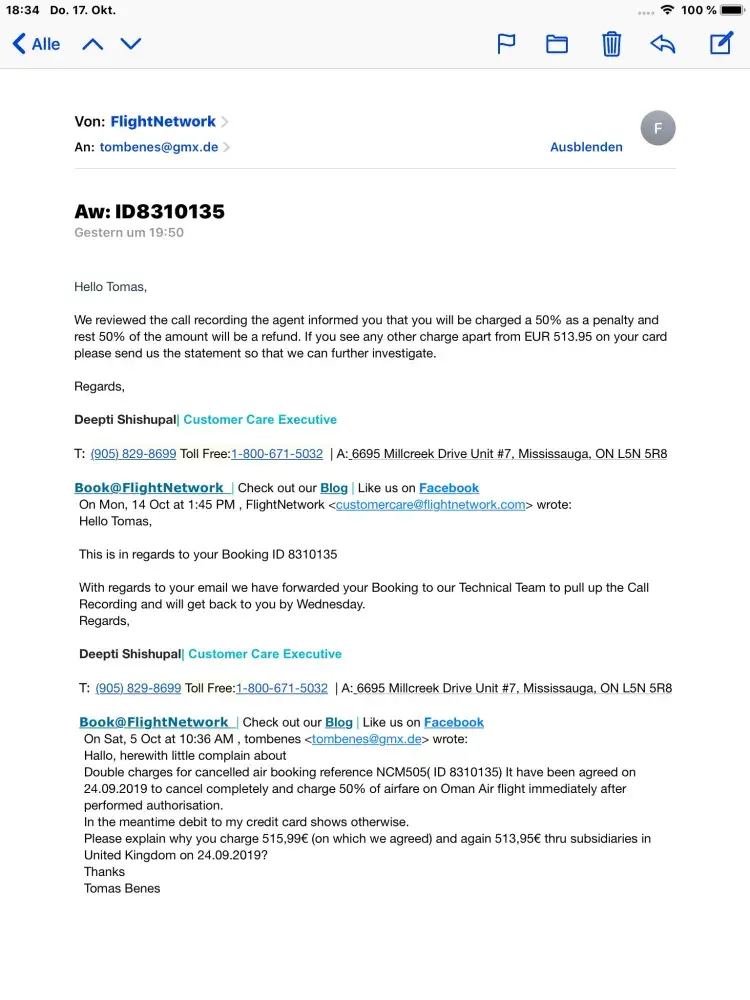 - On the same day Thursday 10th October I received an email from Marc Jathan, apologizing for the inconvenience caused and send me the airline confirmation.