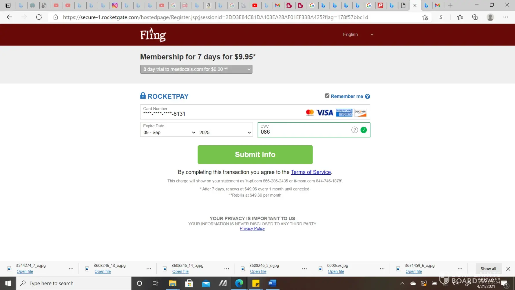 Hello, yesterday my credit card is used for 49 dollars without my notice. It was about membership. I don't know the membership and I didn't subscribe to any types of membership on fling.com. Today, when I check my credit card statement, immediately I opted out of the fling.com. Please, I want my refund to my credit card. I want your help. Thank you very much. Here is the information you needed to process my request: