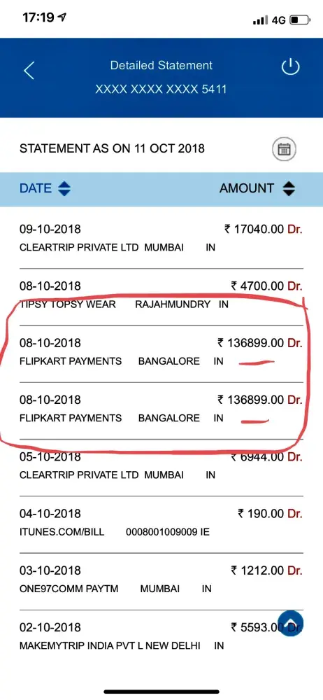 Hello sir, this is bijesh vaishnaw from rajahmundry (andhra pradesh), I have made a purchase of rupees 136899/- on flipkart app on 8th of october 2018 monday for which the payment was made successfully from sbi credit card but the order wasn't completed by flipkart, I have immediately called flipkart and they assured me that the money will be reflected back to my credit card within 3 (three) working days, but this did not happened yet. So as they assured me to return back the payment, I did an other purchase of the same products again on that same date where this time the payment and order both got successfully done and products also got delivered to me. But to my astonishment when I got my credit card bill due statement which generates regularly on 12th of every month, it showed that I was not revised with the amount which was paid to flipkart for an unsuccessful order transaction. For this I again called the flipkart and they looked into the situation and told me to be patient, and this is the same thing being told to me from past 2 weeks. I got frustrated and also posted the incident into social networks but still there isn't any resolutions regarding this. So I have come here to plead the complaint board to help me in this matter where I can get back my paid money of rupees 136899/- for unsuccessful transaction made on flipkart.