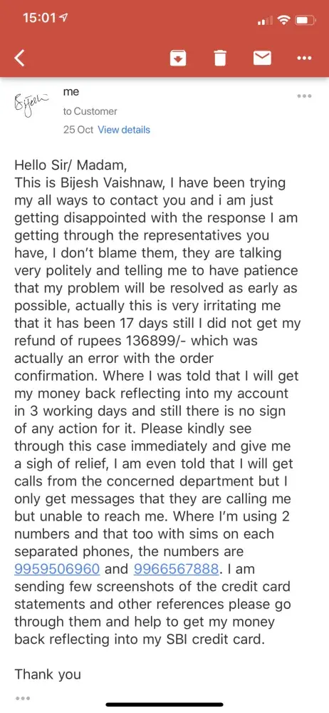 communications, Mr. Abhinav, executive called and assured me he will refund