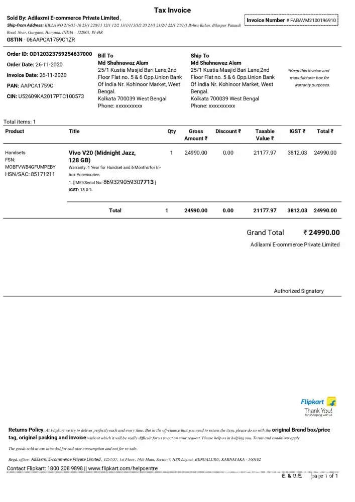 i have purchased vivo v20 (midnight jazz 128gb) on 26th nov 2020 for rs.24990/- as there was one offer on sbi credit card