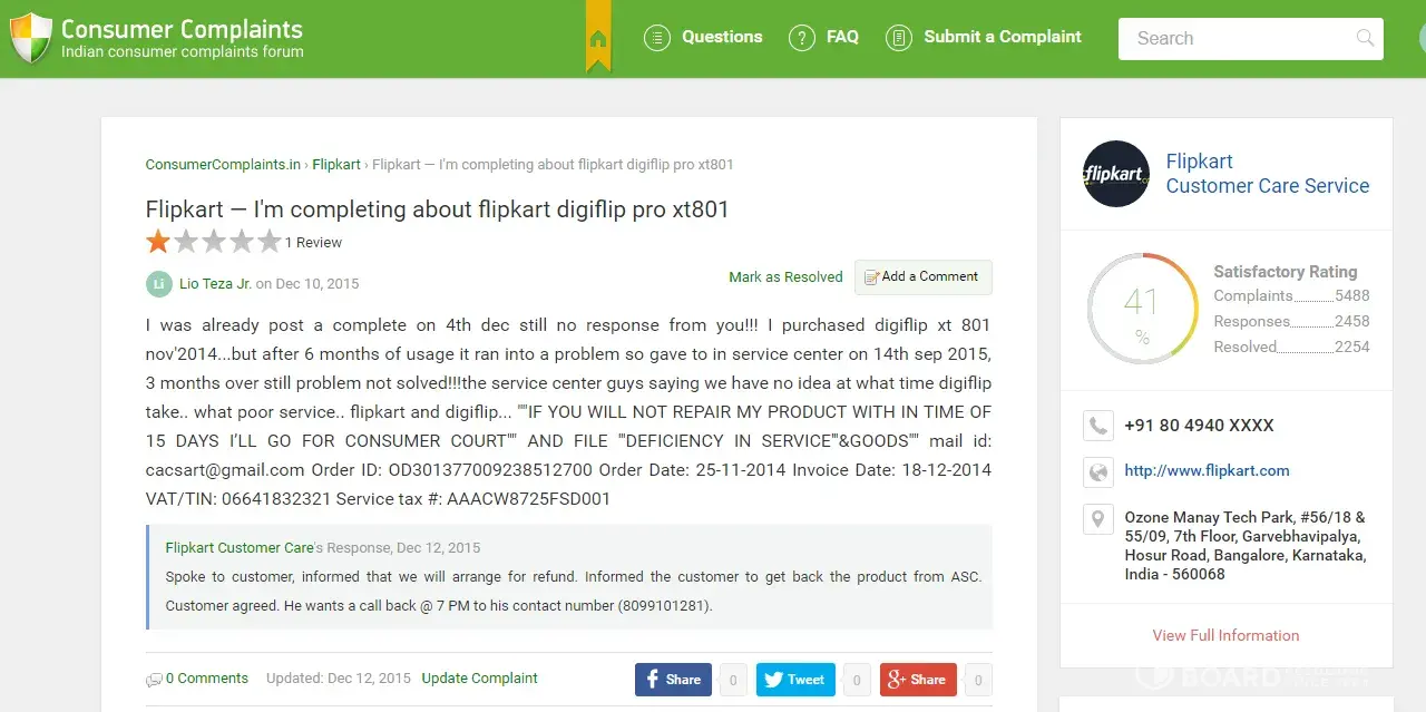 - While Flipkart Internet has a high level of trust, our investigation has revealed that the company's complaint resolution process is inadequate and ineffective. As a result, only 12% of 39 complaints are resolved. The support team may have poor customer service skills, lack of training, or not be well-equipped to handle customer complaints.
