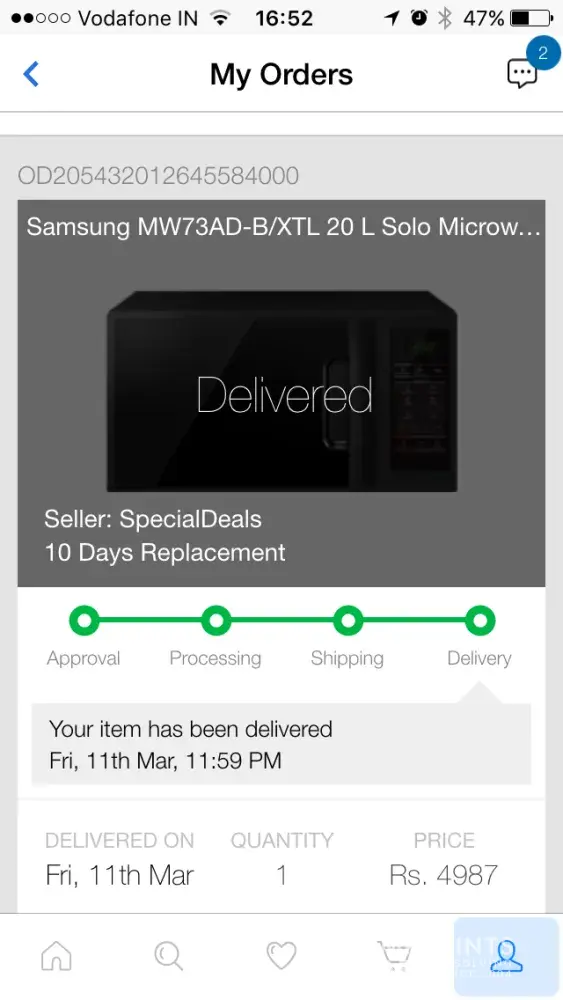 I paid the amount of Rs. 11608 for both the products via my SBI debit card. The expected delivery date was 19-oct-2016. I was tracking the product. It was about to reach.