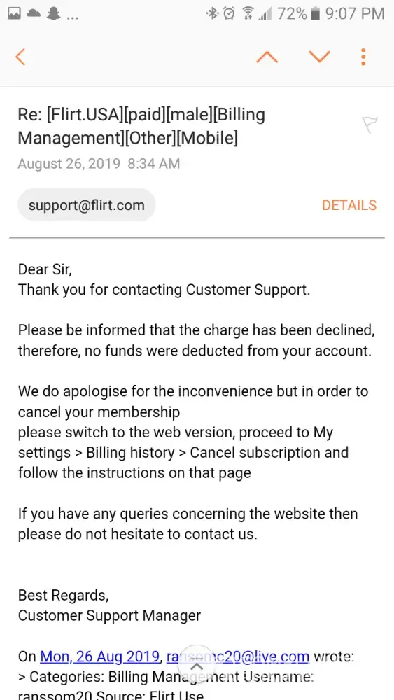 If you attempt to cancel your Flirt.com account, you must go through a multi step process, which ends with you having to talk to someone on the phone to give you a code in order to cancel. However, this telephone number does not work in some countries and you are stuck with no method of cancellation as Flirt.com does not consider emails as legitimate cancellation.