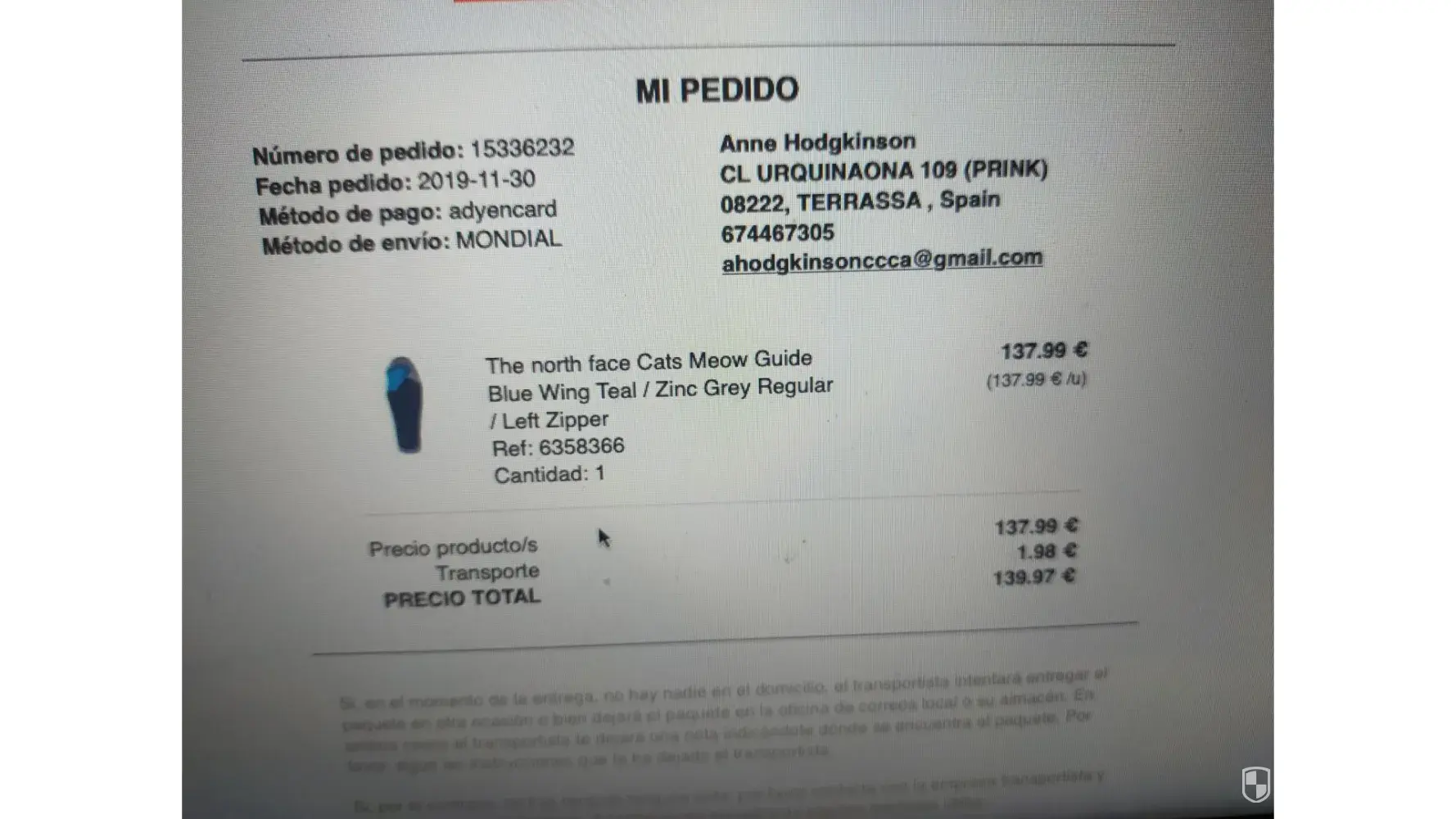 137.99 euros: North Face sleeping bag, 30/11/2019