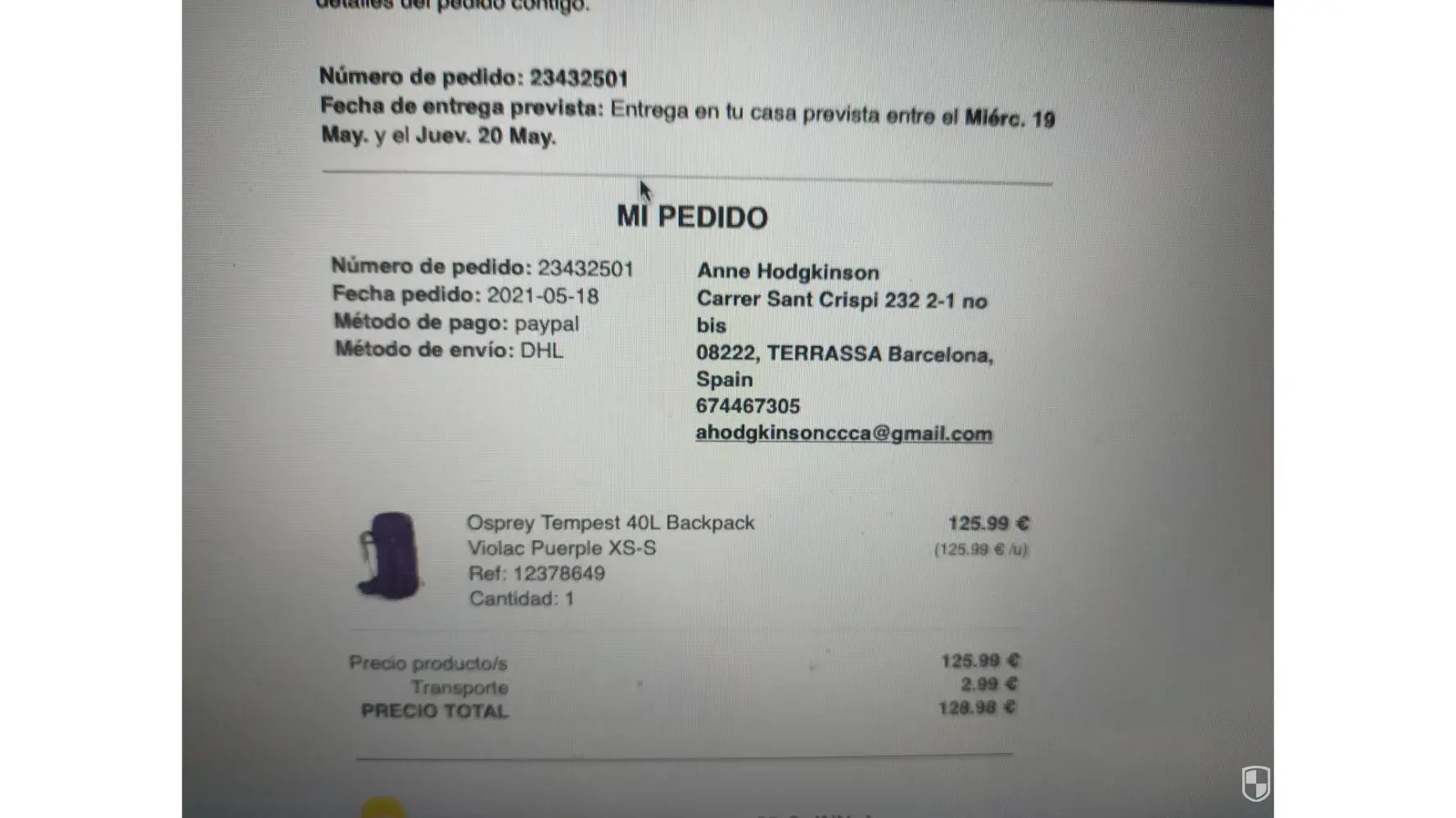 128.98 euros: Osprey backpack, 5/18/2021