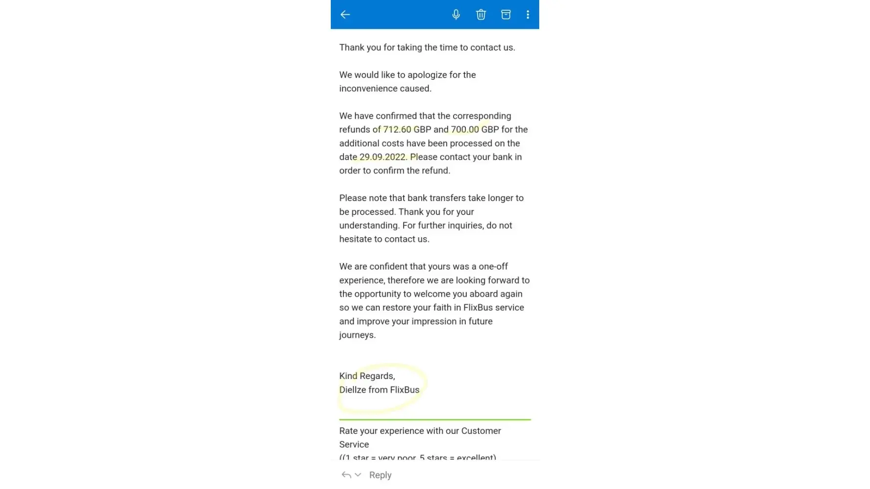 We hold FlixBus responsible for the second payment and expect them to refund us immediately and without delay.