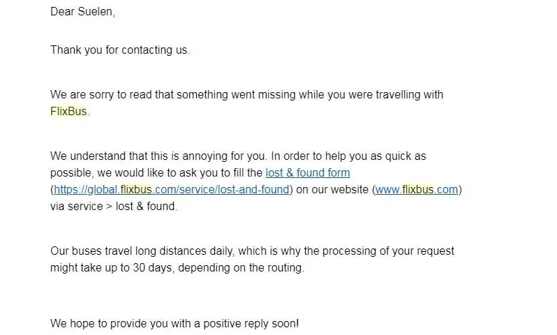 I am completely and deeply amazed about the incompetence of the costumer service of flixbus. The only thing they kept saying despite the fact that the bag was on the bus toward Paris was that I needed to fill in the form, that after, the bag would have reached the deposit and after that in a week or two if it was found they would have given it to me. When I asked where was the deposit I was told, WE DON'T KNOW, THERE IS NO ADRESS, WE DO NOT DEAL WITH THAT ISSUE. How it that possible!, they don't know! I was telling them I was feeling bad that I had no money no id nothing and they just shake their shoulders saying they do not know! Unconceivable!