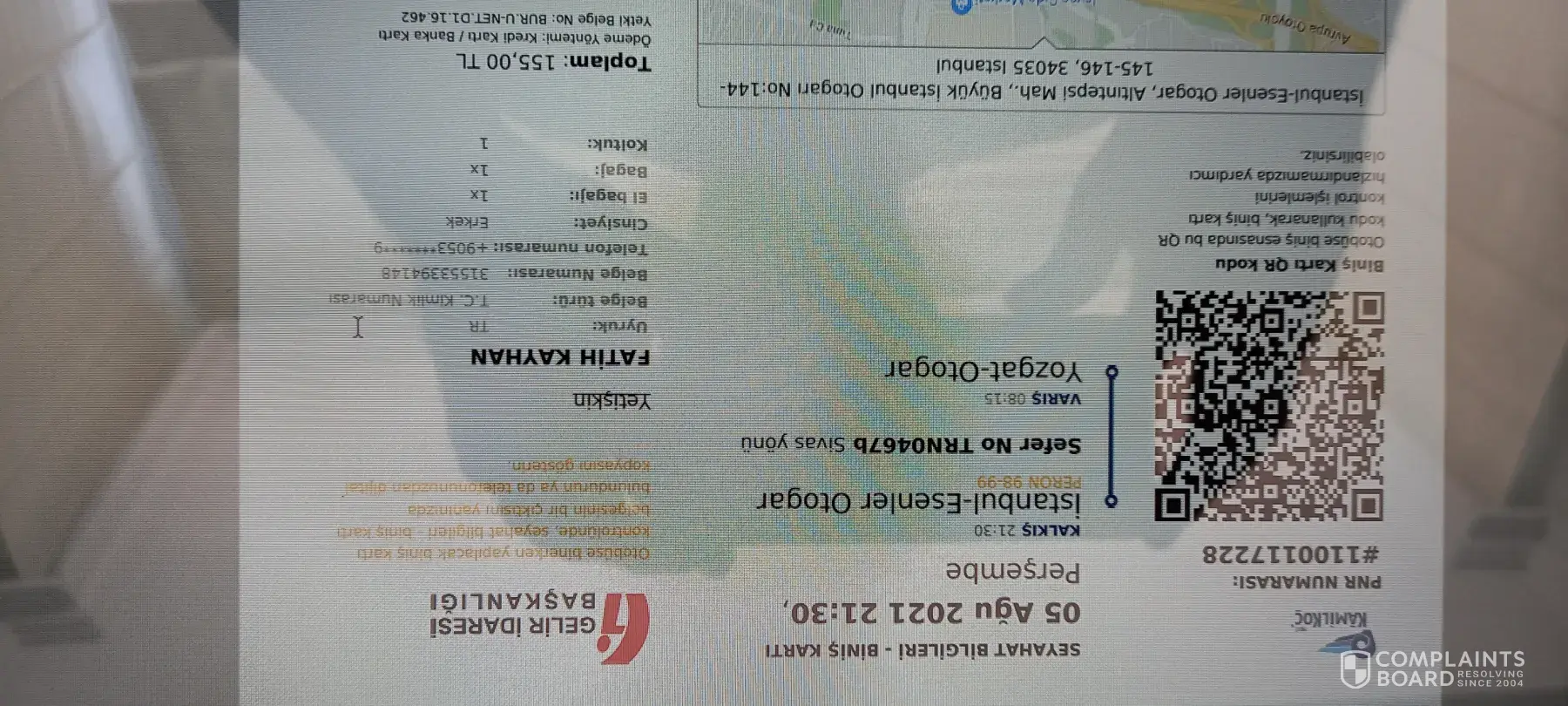 My travel information subject to the complaint: Route: Istanbul Esenler - Yozgat (Turkey); Date: 05 August 2021; Time: 21.30; Seat No:1; PNR No: [protected]