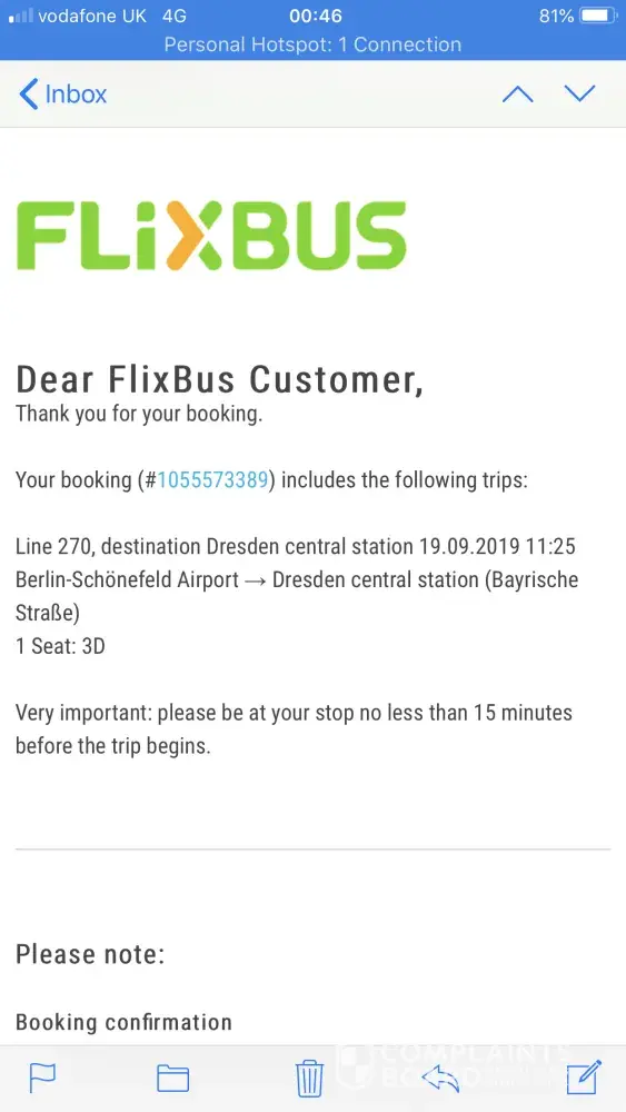 On 19th of September 2019, my partner and I were scheduled to go to Dresden by the Flixbus. Our ticket was at 11:25 in the morning. We arrived at the station at 11:10 am and at the same time a bus passed us. We missed the bus and got in big trouble. I had paid £25 for the ticket and I ask you for the full amount.