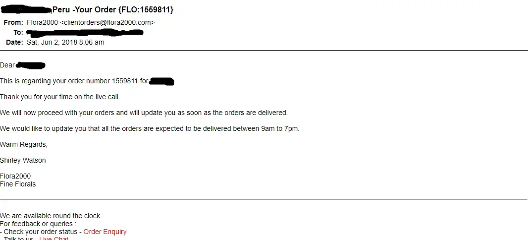 I had used Flora20000 once before, and the order was satisfactory delivered, late, but in the same day. After reading others’ reviews and now having my Valentine’s Delivery date today missed after 7pm with zero contact from the “outlet,†I am going to file a credit card complaint for fraud. This company is based out of India from their WhatsApp chat, and all the responses are copied and pasted — very quick to respond with we are sorry about your failed order. Listen to these reviews and don’t use them. Richard is a fake name.