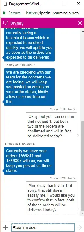 It's some other woman who surprisingly, seemed kind of down to earth and much more nice and helpful than the last one. After about 30 minutes of explaining my situation all over again and then waiting for another 30... She finally replaces the order for me and it FINALLY works. And so afterwards I ask her one last time if she could confirm and guarantee that my delivery would be ordered on this same day. Her exact words were, "yes, absolutely."