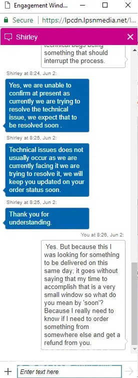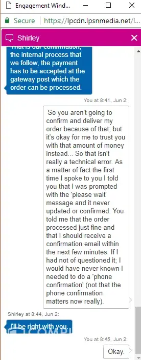 ...I didn't believe her. And after a few minutes passed by without any confirmation emails I looked over my account 'orders' which stated they were 'awaiting confirmation' and so, after bringing that to the attention of the same live chat representative after re-live chatting her again, she said I needed to 'confirm' the transaction over the phone with her. And this was almost expected as I read through the Truthpilot reviews and saw others complaining that their orders were not placed due to this, being under the impression everything was fine but then told only after their botched and failed order wasn't delivered that they had to confirm over the phone that they wanted to place the order.