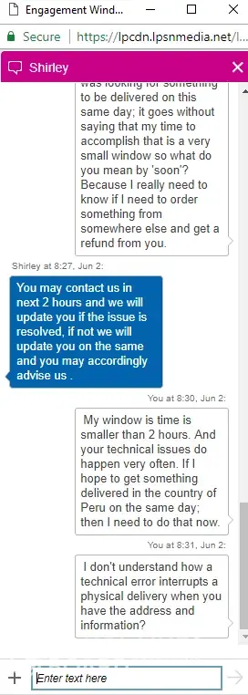 ...I contact the rep. Again. Her and I argued for almost hour about a 'technical error' and that her and her technical team would have a definite answer for me within the next 2 hours. I almost literally begged and pleaded with her to just tell me if the delivery would be good to go or not because it was REALLY important it be delivered today. And she just kept going on her two hour spiel.