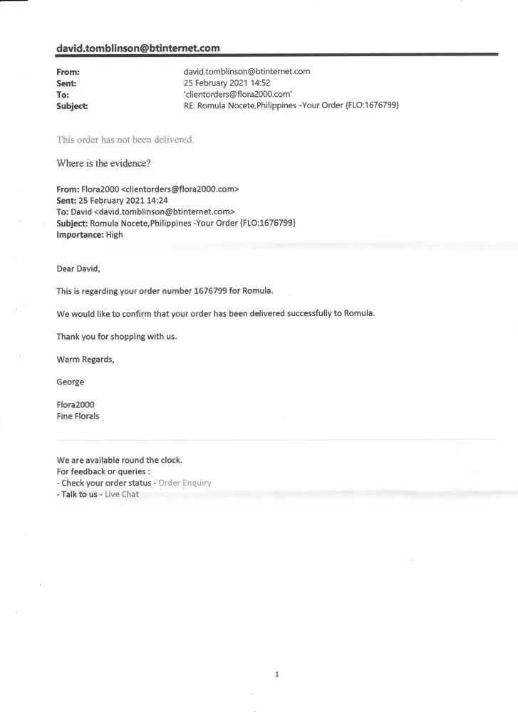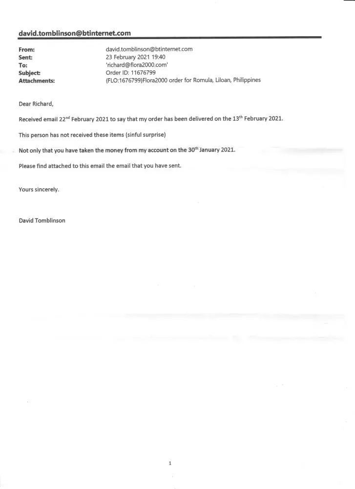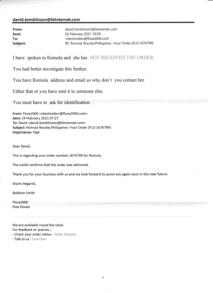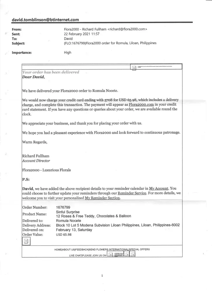 Received an email from Richard Fullham 22nd February 2021 confirming that my order to Romula Nocete.