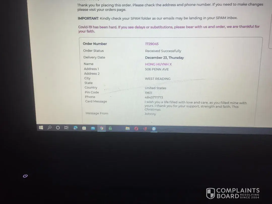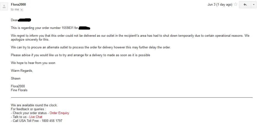 On the 7th of February I ordered a gift to be sent on the 10th of February. There was no delivery. I have tried every means to contact this florist, but everything is a scam. The 1800 number does not get answered. Th ;live chat does not work. I emailed every contact on the site (Including the job application email) and there was no answer.