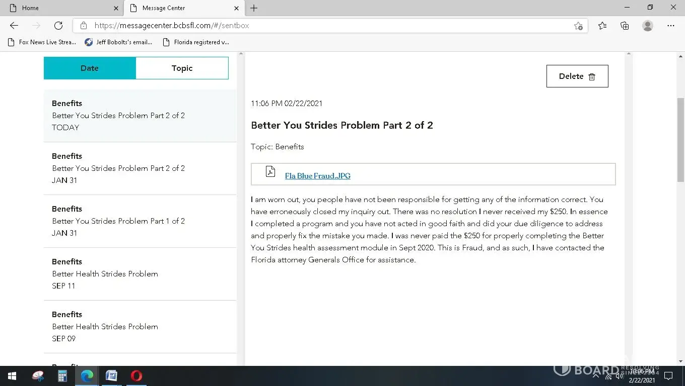 Along with writing you, I have filed a complaint with the Attorney Generals Office here in Fla. To whom it may concern. This is the story of an ongoing problem that to date has not been resolved. Florida Blue owes me the amount of $250, as a benefit from participating and completing a module in their Better Health Strides program. All conversations I...