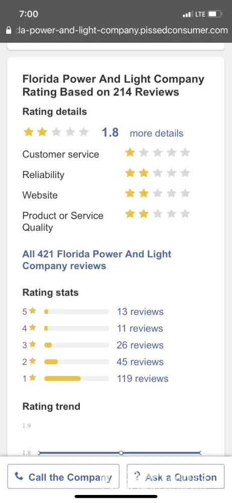 Florida Power & Light [FPL] earns a 1.4-star rating from 2 reviews and 785 complaints, showing that the majority of customers are dissatisfied with service.