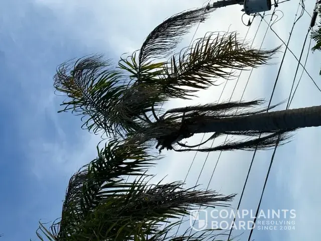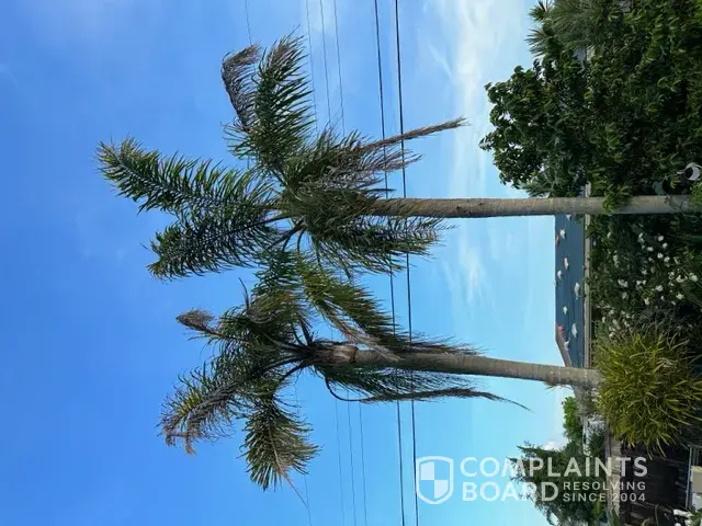 Desired outcome: Reimbursement for having to cut down my healthy palm tree due to the negligence of your Line Clearing Crew.I am traveling from Friday, July 7th to Sunday, July 30th. My email is [protected]@aol.com. My cell number is [protected]