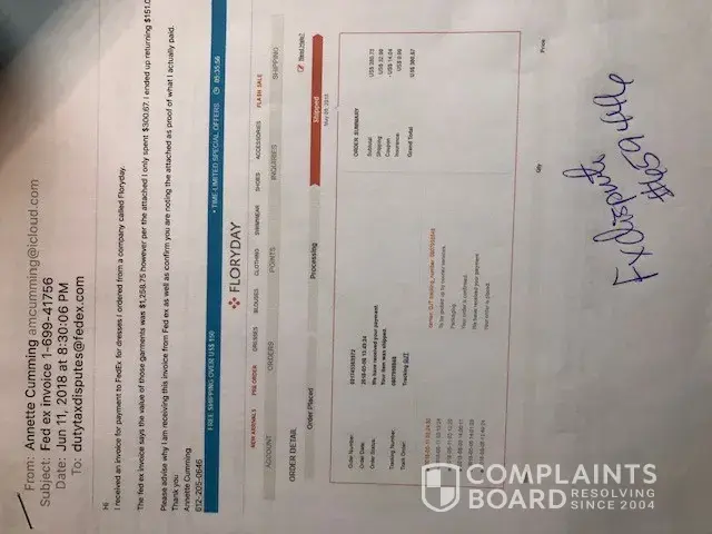 I purchased $300USD of clothing however on the shipment for customs they listed it as $1200 USD. I ended up having to pay another $200 USD in custom fees. Floryday would not return my calls or emails. My order # with FloryDay was [protected]. I tried disputing the charge with Fed Ex however was told there was nothing they could do since FloryDay listed the shipment amount at $1200. I am attaching a copy of my original invoice + the customs bill + the Fed Ex invoice.