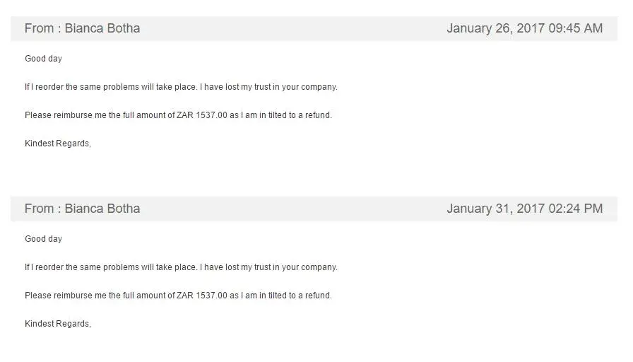 JANUARY 25, 2017 02:46 AM Cathy replied me informing me that they would give me a coupon valid of the full amount I purchased in the items I was suppose to get. But I replied telling her I am entitled to get a full refund on the January 25, 2017 02:40 PM.