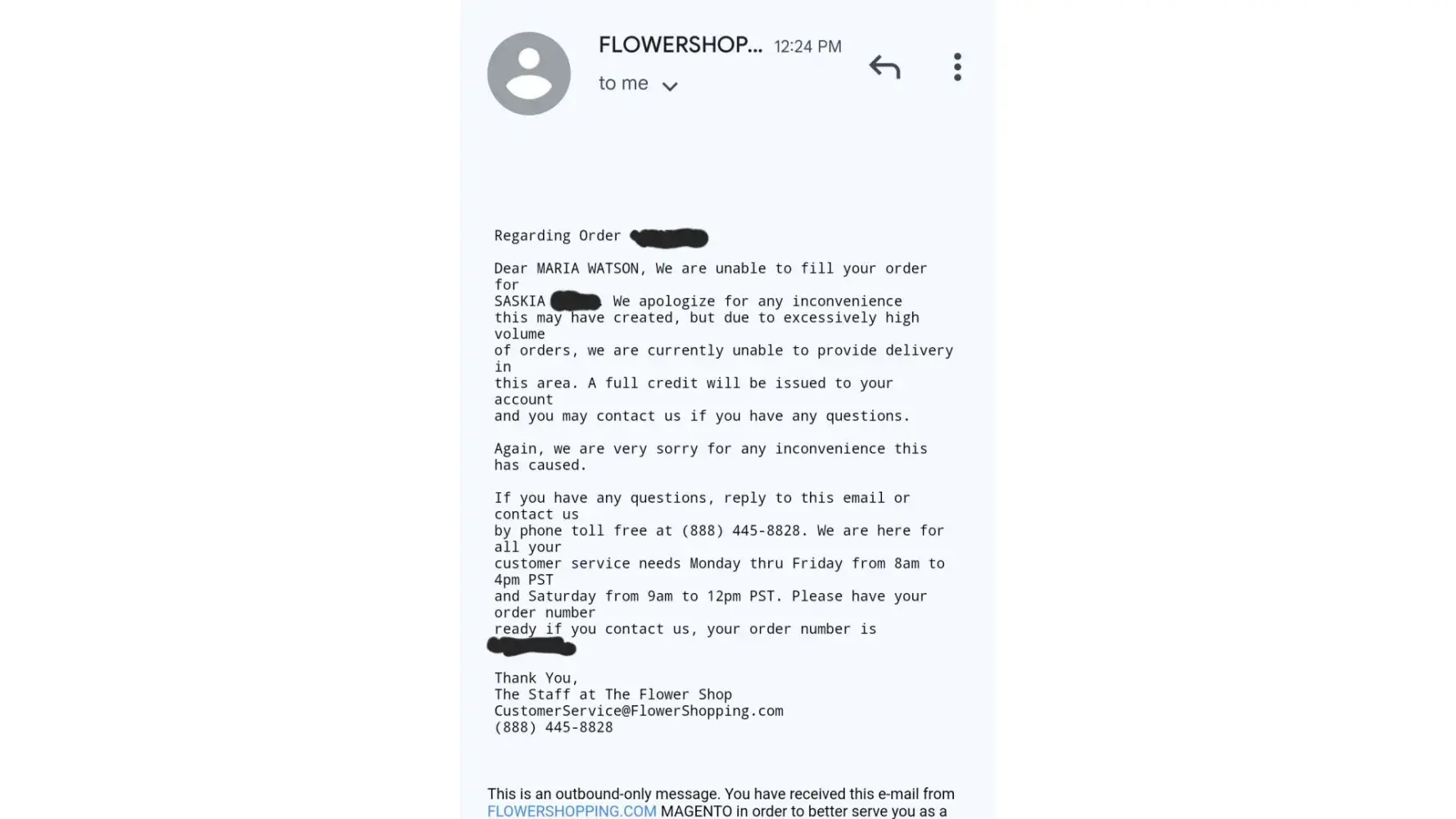 Terrible customer service. I ordered a sympathy basket of all white flowers to be sent to my grandmother to show our condolences for my grandfather passing in March 9. The bouquet that was sent contained bright pink and purple flowers. Customer service said they would refund me 15% of my purchase price. I paid extra to have the flowers delivered the same day before 4- I did this for a reason. When I expressed I was not happy with this, they said they would see if they could get the flowers picked up to possibly give me a refund. When the florist said they made the bouquet I ordered and would be delivering it (which is now March 10), flowershopping.com said I would no longer be getting any discount on my purchase price. The florist said that flowershopping.com sent her the wrong bouquet that was to be made and they refuse to take any accountability for their actions.