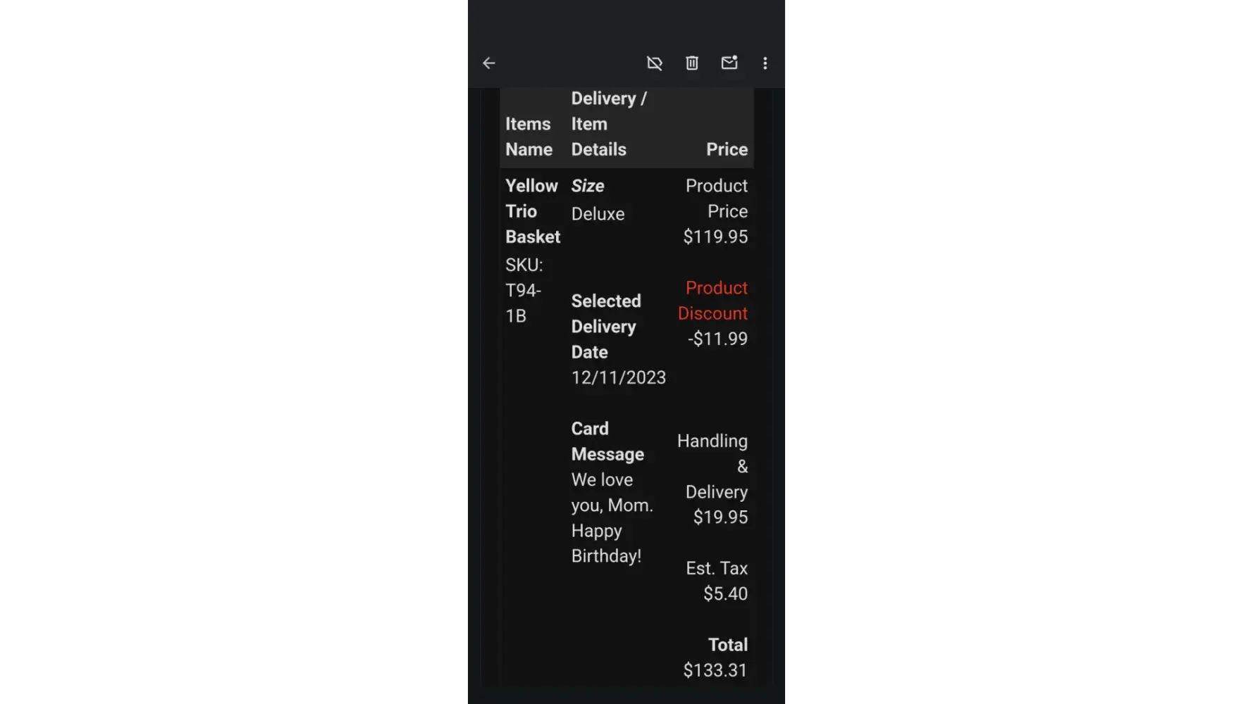 My mother got a Mother's Day Surprise ! NOTHING FOR MOTHER'S DAY. I paid over $90 for flowers for Mother's Day on April 29th. On Saturday, May 9th, I received email conformation that the flowers had been delivered. On Mothers's Day I learned that she had received NOTHING. I called the following Monday to register a complaint and request a refund. That request was ingored. I had to spend time to send a dispute to my credit card company. I doubt I'll ever see that money again.