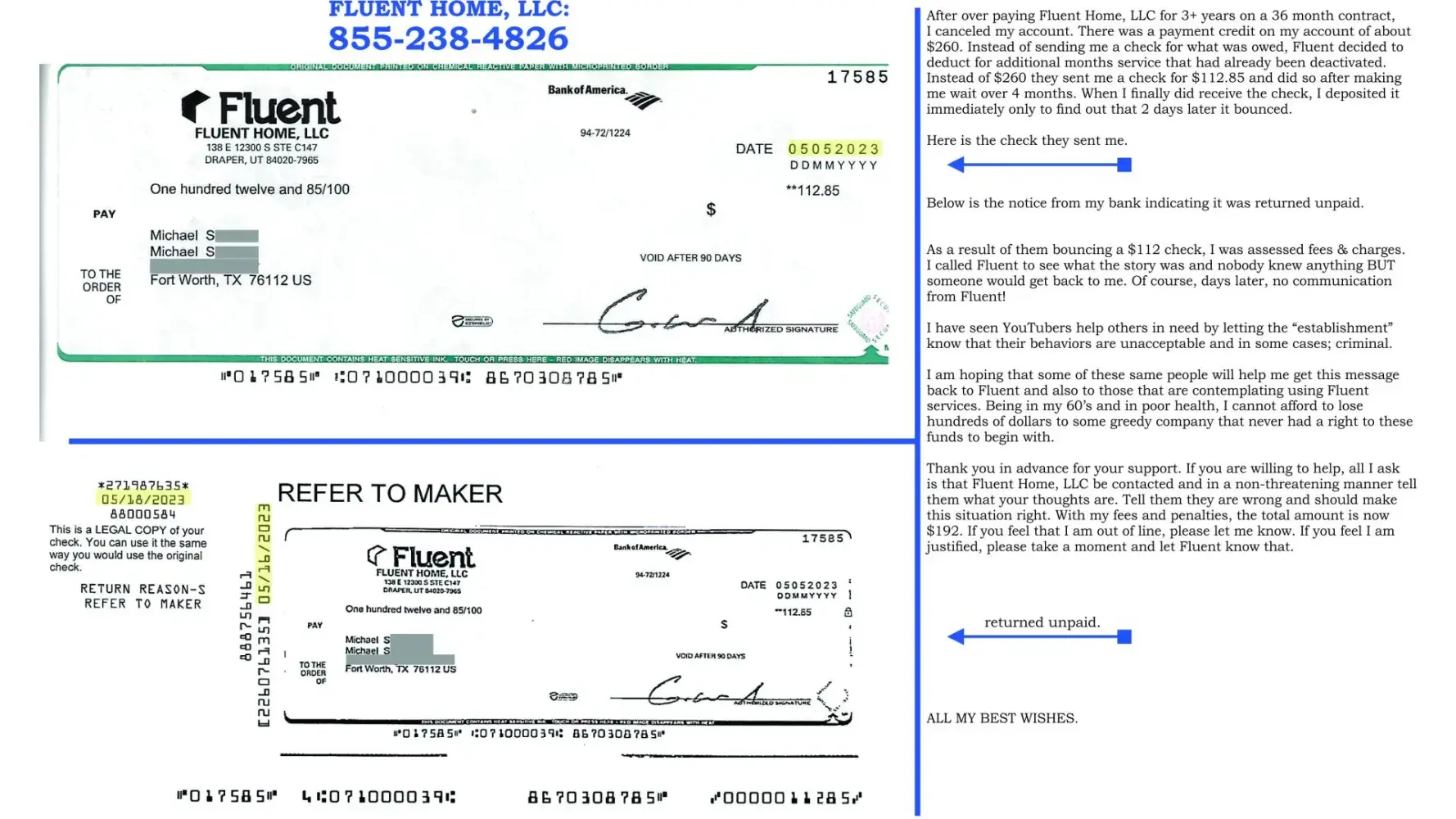 The information is self evident. I have copies of the "contract" ALL emails and ALL payments made to Fluent Home, LLC. However, at this point in time, that info is irrelevant since the check was ultimately written and was in fact returned "DISHONORED".