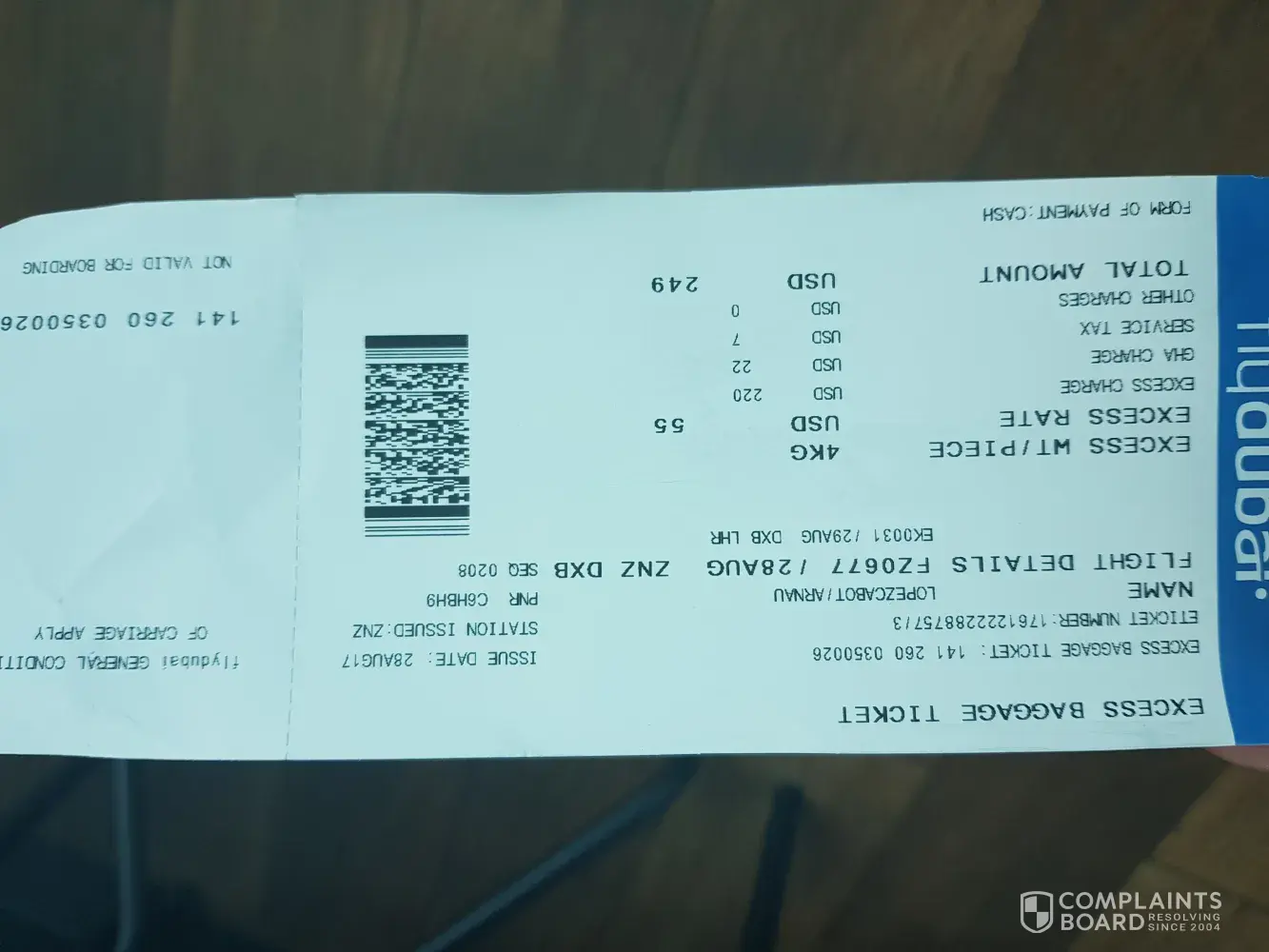 Taking my flight back from Zanzibar to Dubai, flight number FZ 677, the total weight on my sports equipment was 34 kg, 4 kilos above the allowed 30kg. On the airport, they made me pay 55 dollars per additional kilo, totalling 249 USD. This is way above the rates that you have on your online for zone 3 (55 EAD, not USD). I have uploaded a picture of the receipt I got in the airport.