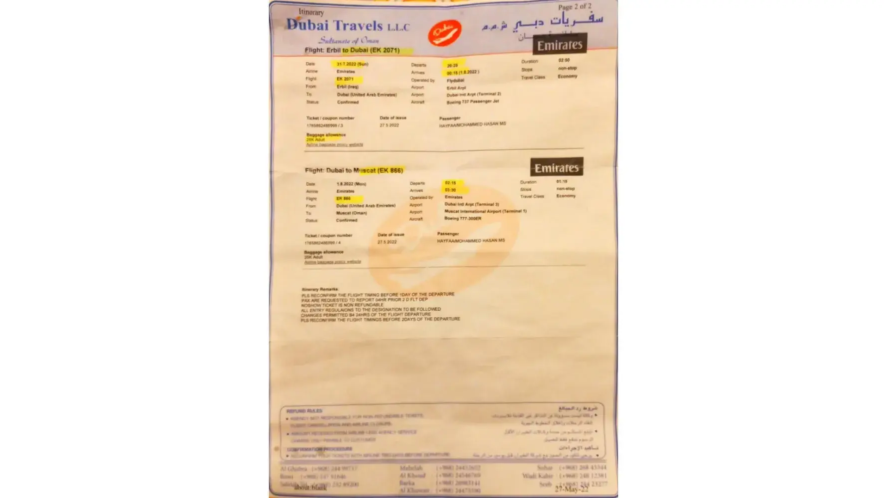 On 31st of July I arrived Erbil airport 3 hours to complete check in and boarding, coming from different city, when I was Shockley surprised that my trip from Dubai to Muscat has been cancelled without any prior notice from the agency/company despite providing them with all my details. The airport authority then refused to complete check in to Dubai claiming I need a visa to Dubai or book for next available flight from Dubai to Muscat, in which the transit was extended for 18 hr in Dubai Int airport. I left with no choice rather accepting to purchase a new ticket or will lose the flight from Erbil to Dubai. Disappointingly, the cost of the ticket was OMR 75, however the staff has wrongly but my name on the ticked and they then asked me further $ 100 to correct the name despite their fault and put the cost on me without any ownership responsibility and squeezed me to either agree or I cant continue my flights.