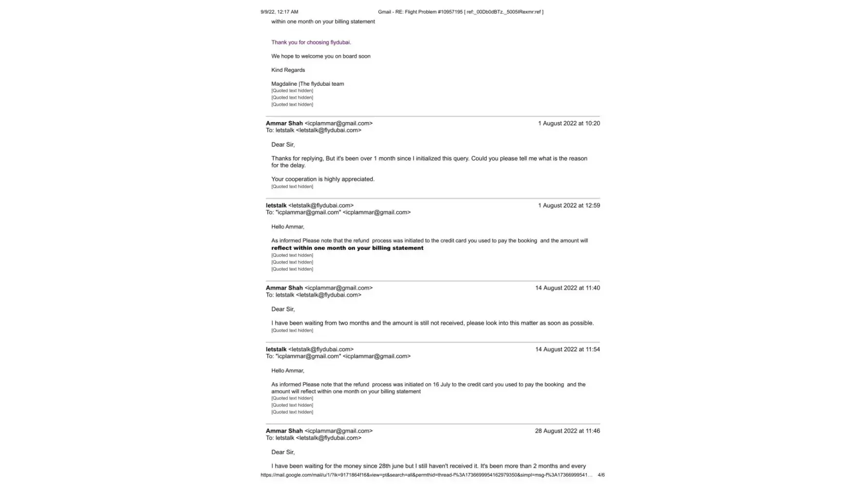 And adding insult to injury, I was refunded with a voucher and not to my credit card, so I contacted the letstalk email only to be told the following: “ We understand your point of view regarding your refund preference, however, all flydubai refunds are issued to voucher only according to our terms and conditions, that was accepted by the customer at the time of booking.â€