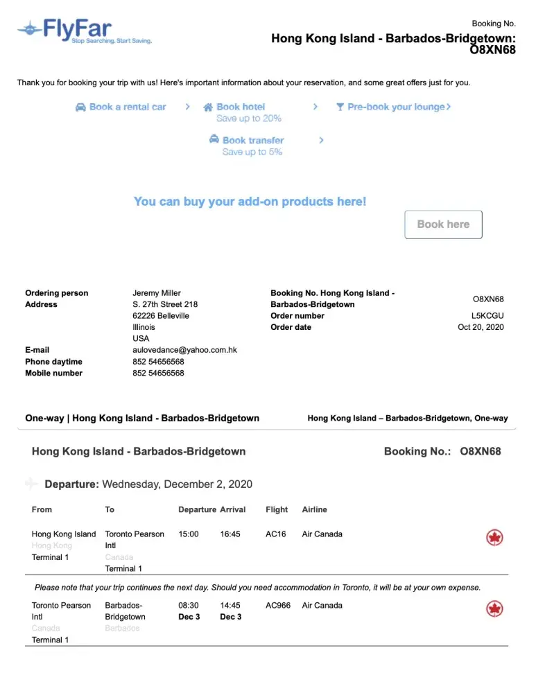 FlyFar sold me a ticket from Hong Kong to Barbados for Dec 2nd. They then emailed me saying they had to move the flight back a week to Dec 6th, and said I needed to pay another $30 USD to make the change. Then when the new flight date arrived, I was denied boarding at the airport because the ticket was no good.