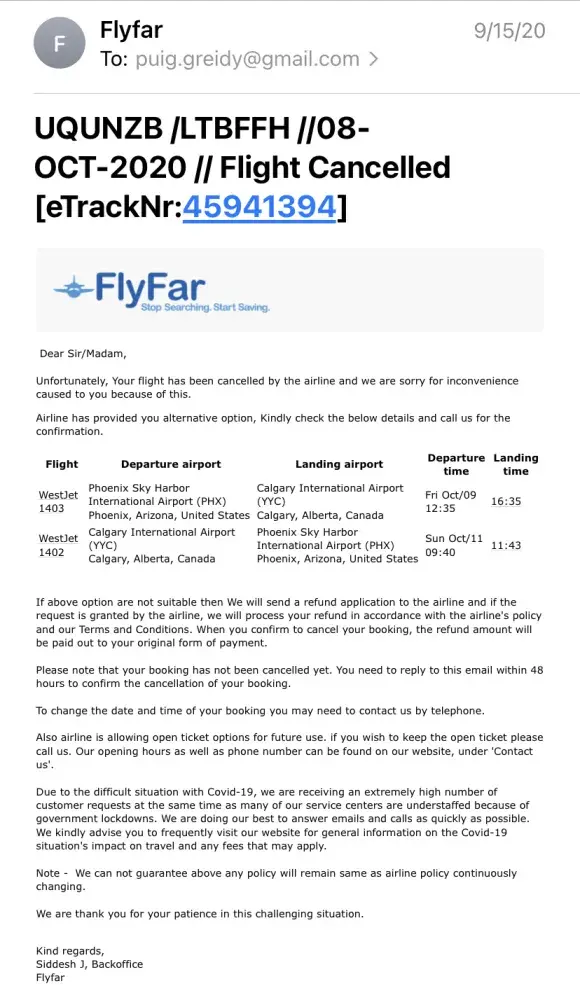To fly July of 2020 from US to Canada via Flayfar. This ticket was then changed to October due to Covid-19 and border restrictions. FlyFar contacted me in September letting me know the flight had been cancelled and I could apply for a refund. I called the agency within 24 hrs and submitted a request to have refund issued. Turns out the flight was never cancelled by agency and FlyFar didn't submit a refund request in time. The airline (WestJet) is now stating I was a no show on that flight and rejecting any refund or even vouchers. I have paid over $200 in fees to this agency to carry out these transactions on my behalf and they didn't provide service paid for.