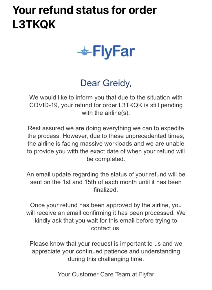 On July 3, 202 we canceled our trip from Amsterdam to NYC, and the company FlyFar, has received the money from Norwegian Airlines already. Three months have passed and I still haven't gotten my money back. I tried contacting them but have received no email back, and as well they have said that they will send update emails on our refund but we haven't received a single one. I will attach the emails below.