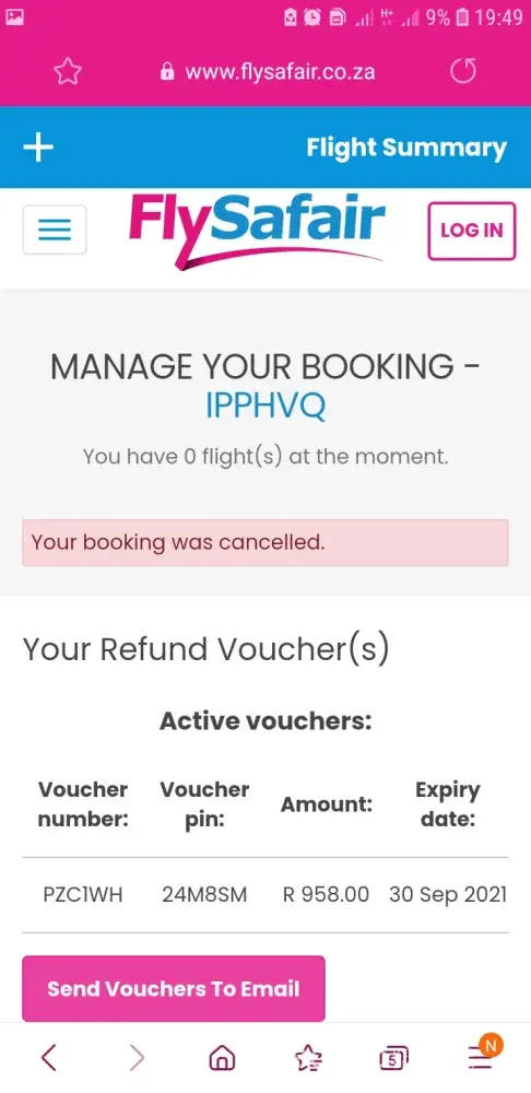 I therefore contacted Fly Safair on their whatsapp where I was notified there is another active reservation which I knew NOTHING about; reservation XYWRBD! they said I can get vouchers for it, to which l refused to, as I am not interested and was never intended to take vouchers. I demanded to be paid the full refund for my tickets