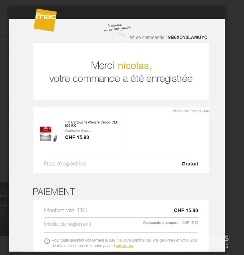As raised by email to [protected]@ch.fnac.com , an order has been passed at my name from the Fnac.CH website.