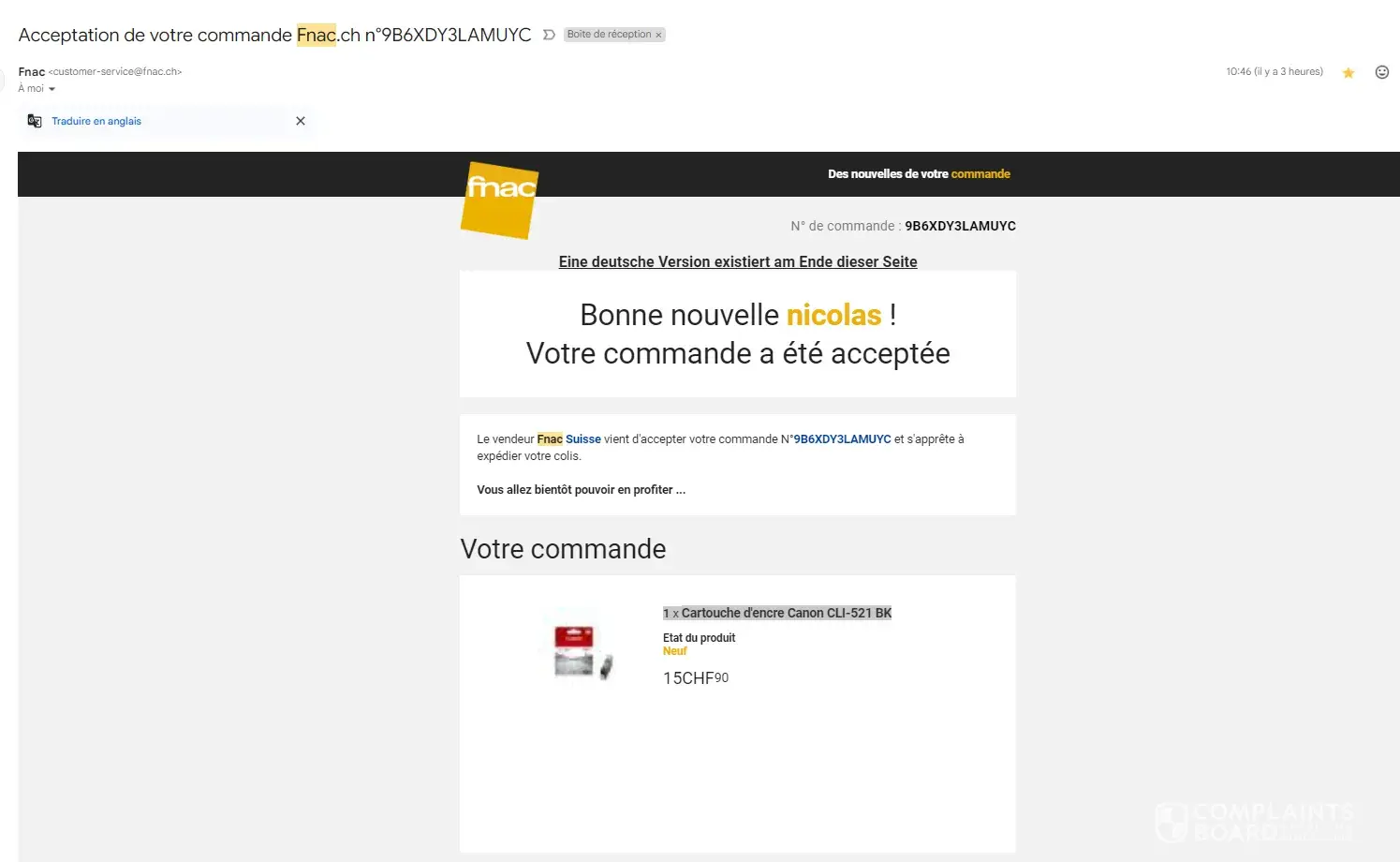 The order no is 9B6XDY3LAMUYC for the following product '1 x Cartouche d'encre Canon CLI-521 BK'; the order has been approved today.