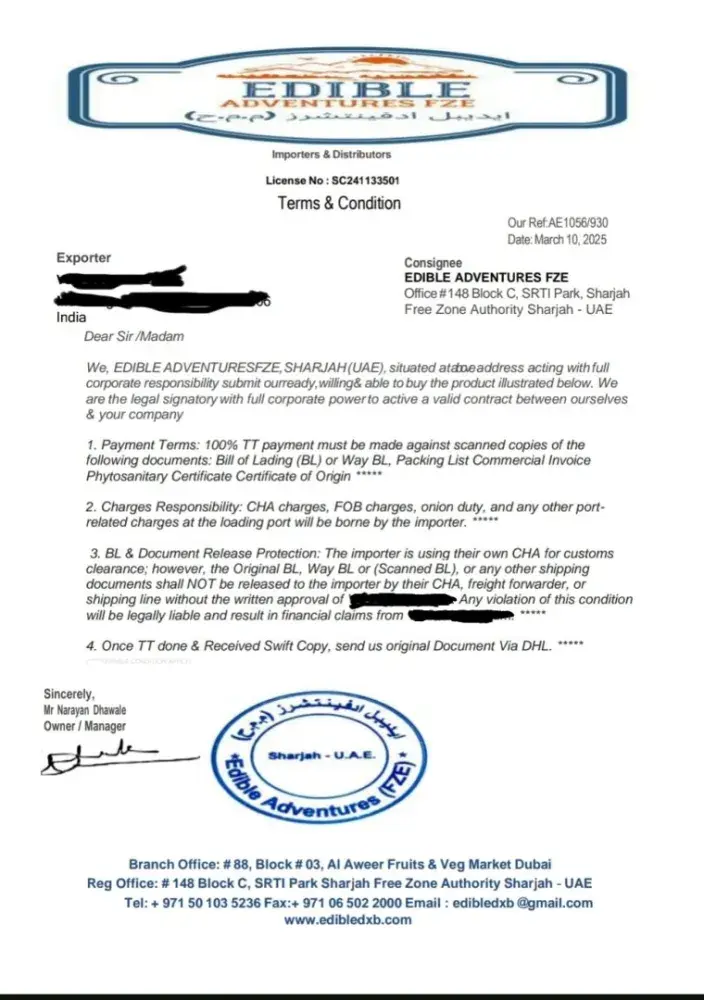 🚨FRAUD ALERT – SCAM WARNING🚨 We are issuing a serious warning about a company operating under the name Edible Adventures FZE, based in Sharjah, UAE. Mr. Narayan Dhawale, the point of contact for this company, placed an order for goods, received the full shipment, and is now completely unresponsive. All attempts to contact him via calls or message...
