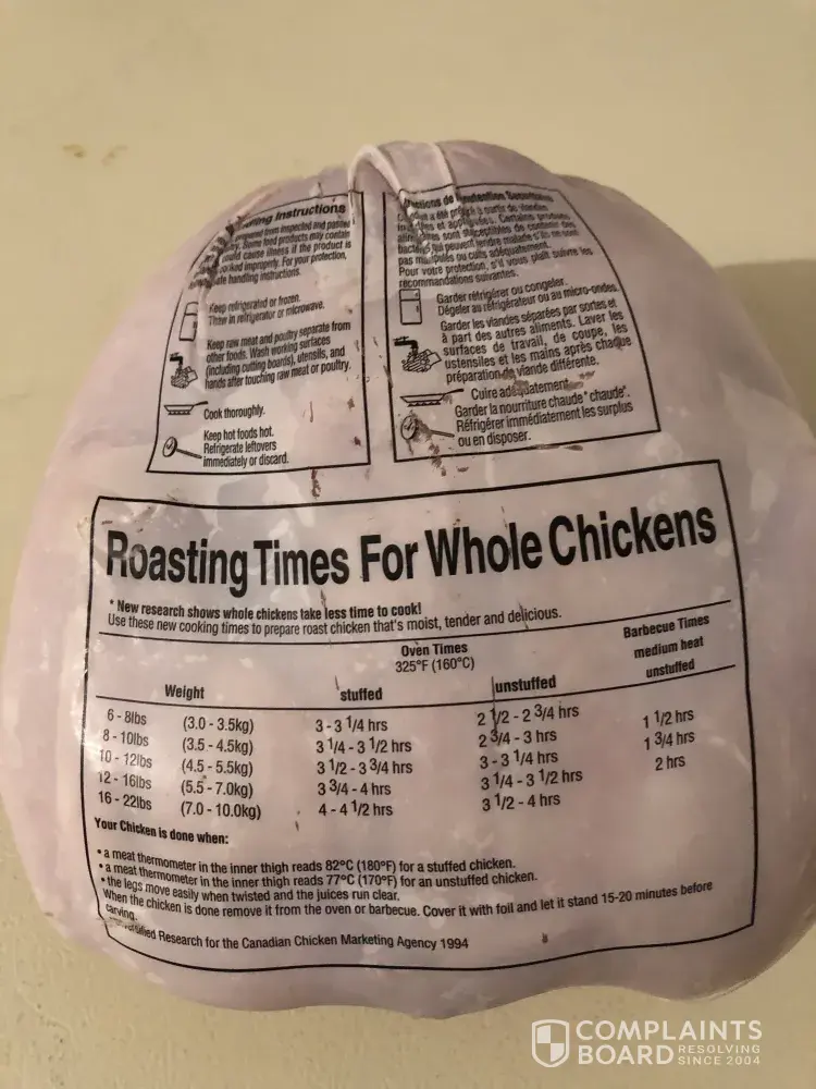 On April 13, I purchased two Sunrise Mature Chickens. I roasted one of them on April 23 and attempted to eat it but there was little bit of meat on it and there was also feathers still on the chicken. Also what meat there was on it was very rubbery. I returned to the store and explained that I was not happy with the chicken and I wanted a refund. They said...