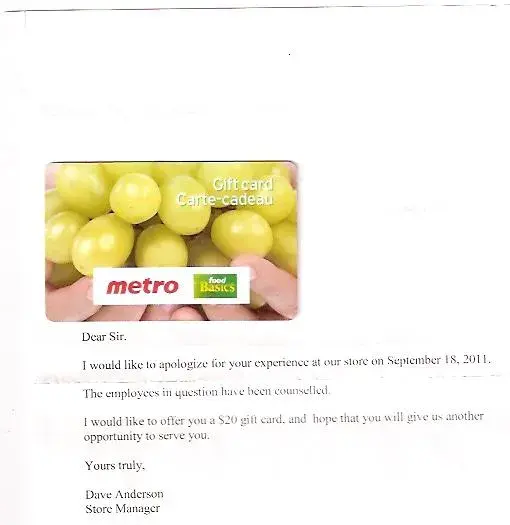 He following was my email to metro head office.