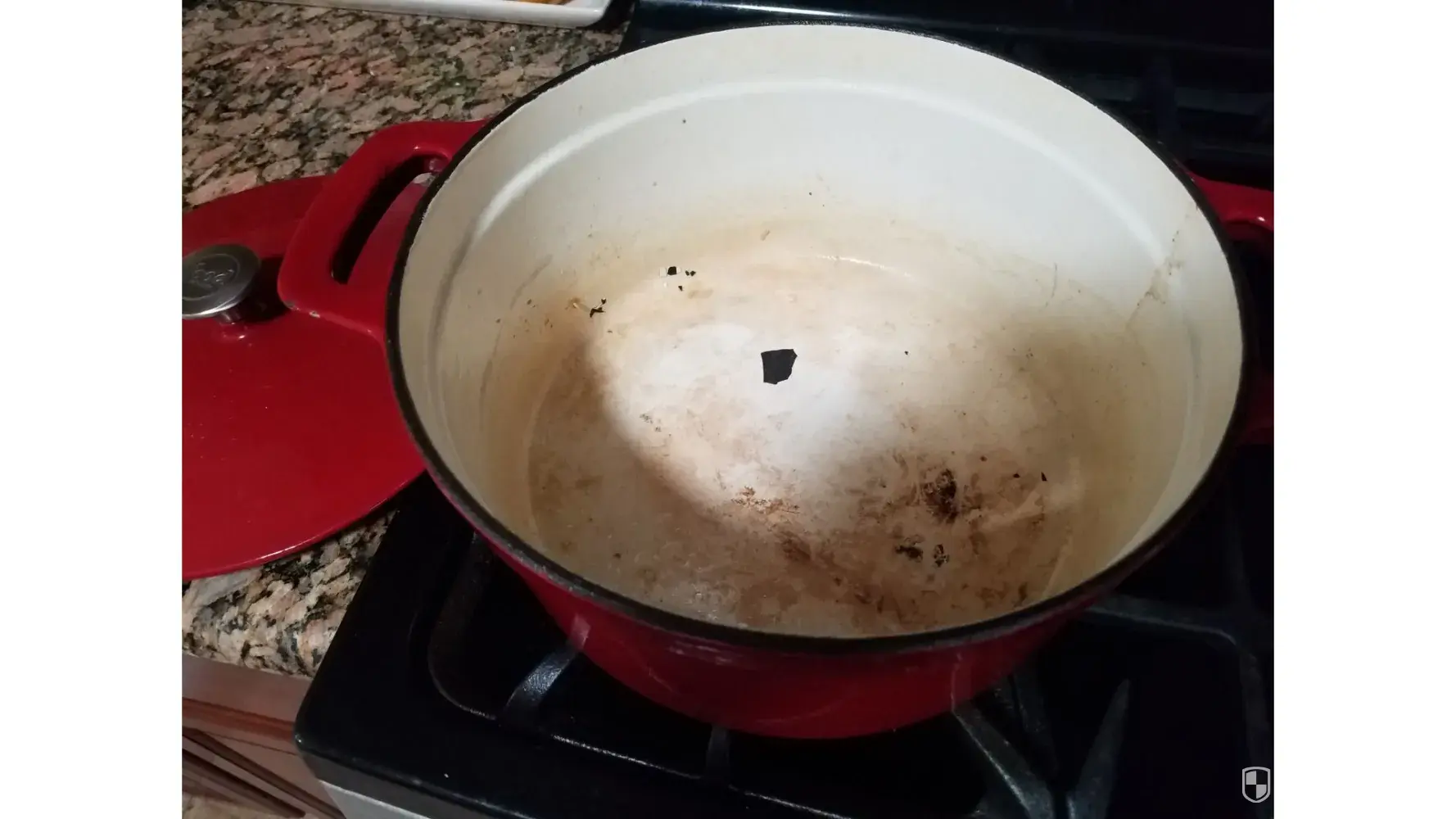 I was cooking chicken tinola and noticed black thing floating as I was stirring pot. I scooped it out and was hard stuff. It was metal. I poured all mixture into another pot and saw the pot has chipped.