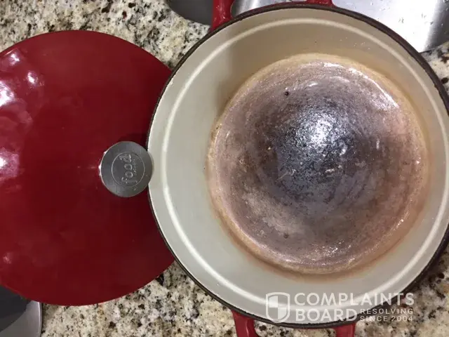 I purchased a food network branded dutch oven at Kohl's. After a few years and very light usage, the bottom finish is peeling off. I am concerned about the finish chips going into the food. I am not going to use this product at this point due to the concern of the chemical finishing contaminating the cooked food.