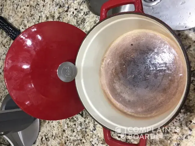 Hello. My husband, who shouldn't be allowed in the kitchen, cooked rice in our new, beautiful, teal 5.5 qt. Dutch oven by the Food Network. The bottom enamel came apart as a result. It's dangerous to continue using as I researched ways to clean it following the disaster. These babies aren't cheap! Is there, by chance, any way I can send you the burnt one and exchange for a new one then he is grounded from ever using? I planned on growing old with it. 👩â€ðŸ³Sincerely- ‘Sisi' [protected]@gmail.com